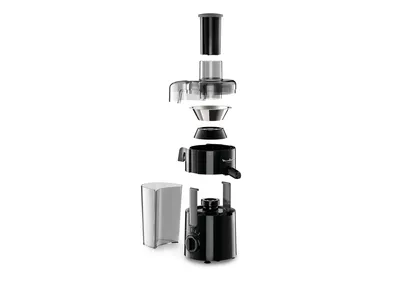 Su amplia apertura permite introducir trozos grandes e incluso piezas enteras de fruta con total facilidad, mientras que los 350 W de potencia, las 2 velocidades y la función Pulse permiten trocear, exprimir y mezclar a la perfección.