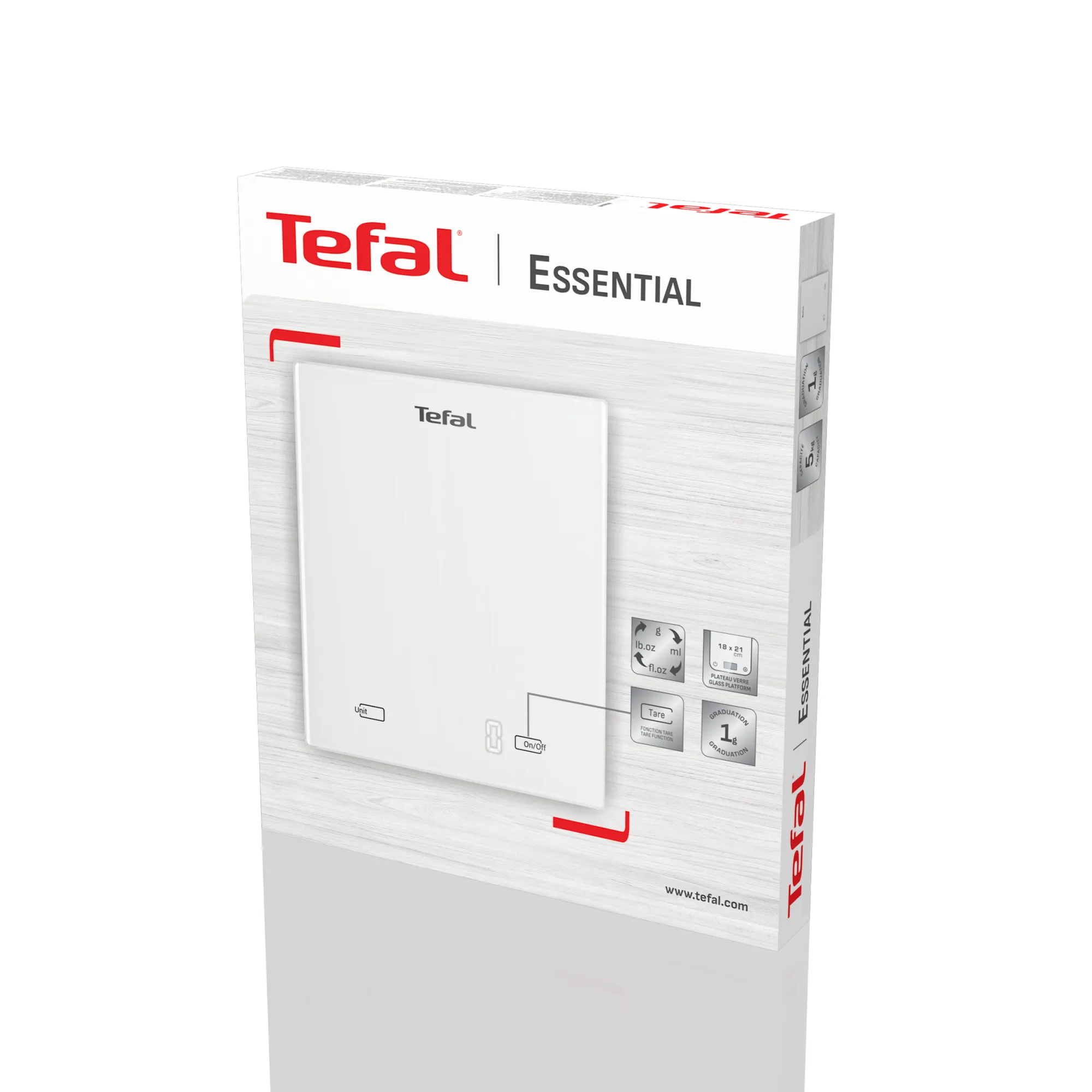 Tefal Essential BC5504V0. Tipo: Báscula electrónica de cocina, Capacidad máxima de peso: 5 kg, Precisión: 1 g. Tipo de visualizador: LCD, Tamaño de la pantalla (HxV): 46 x 20 mm. Tipo de batería: AAA, Tecnología de batería: Alcalino, Voltaje de la pila: 1,5 V. Ancho: 180 mm, Profundidad: 210 mm, Altura: 15 mm. Ancho del paquete: 187 mm, Profundidad del paquete: 218 mm, Altura del paquete: 26 mm