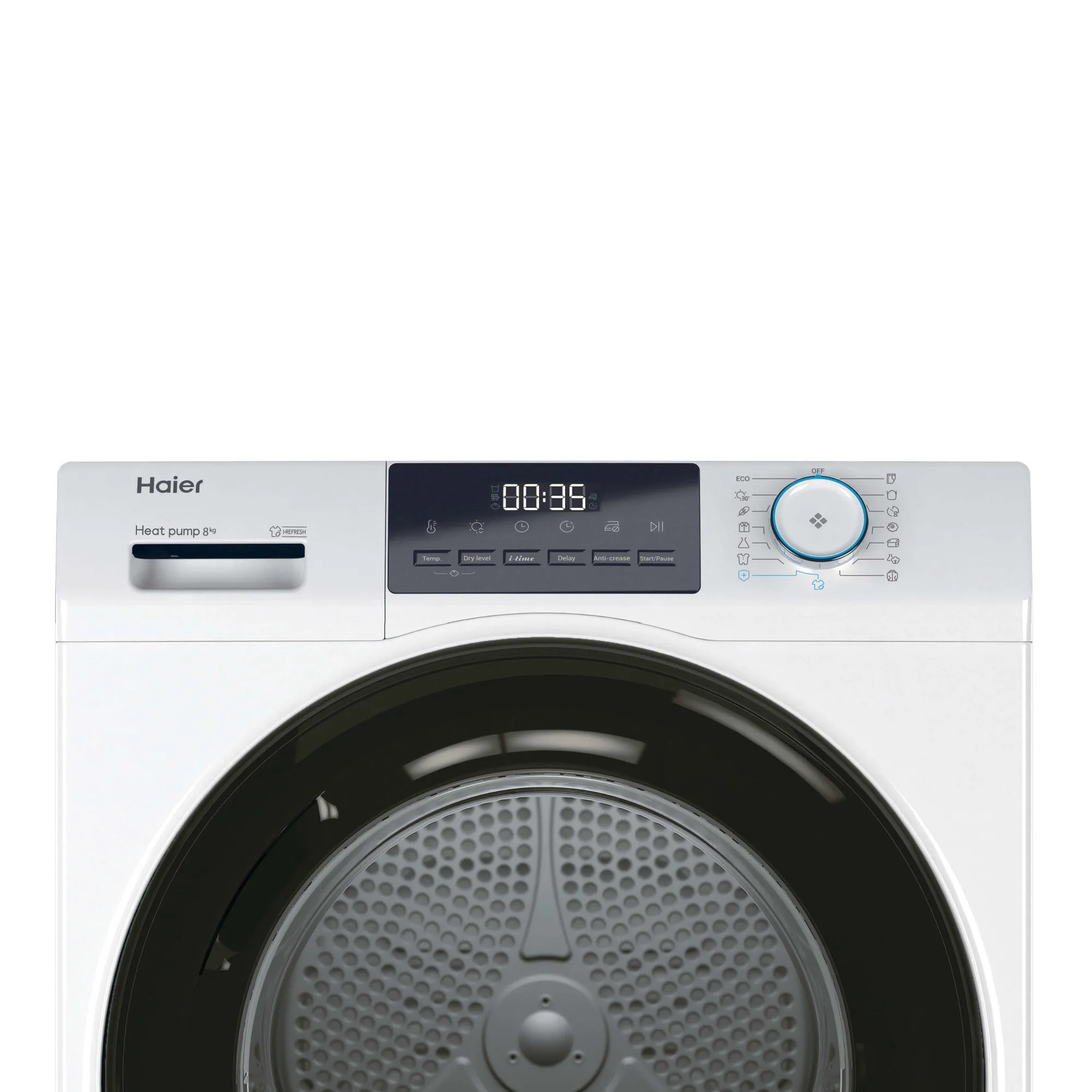 Haier HD80-E929E-S. Tipo de instalación: Independiente, Tipo de carga: Carga frontal, Sistema de secado: Bomba de calor. Capacidad nominal: 8 kg, Clase de eficiencia de condensación: B, Programas de secado: Cuidado del bebé, Delicado/seda, Eco, Mix, Rápido, Refresh, Deporte, Sintético, Lana. Inicio retrasado: 24 h. Clase de eficiencia de energía: E, Consumo de energía por 100 ciclos: 128 kWh, Consumo de energía: 1,28 kWh. Profundidad: 650 mm, Ancho: 596 mm, Altura: 850 mm